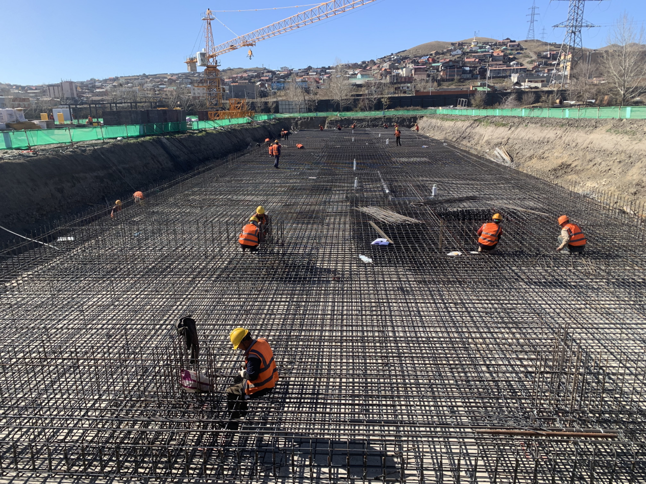 本項目位于蒙古國首都烏蘭巴托的核心區域,總建筑面積達14.8萬平方米,主要包括12棟9層住宅樓和8棟12層住宅樓,共計1980戶住宅單元,是烏蘭巴托市重點民生工程。項目開工建設后,從土方大開挖到大面積支模,從縱橫交錯密如蛛網的鋼筋綁扎到筏板基礎大體積混凝土澆筑,項目團隊以“開局就是決戰,起步就要沖刺”的奮斗姿態,合理調配施工力量,嚴格落實安全管控與質量監督,筑牢安全質量“雙防線”,保障作業流程安全無縫銜接。連日來,二百余名建設者凝心聚力,攻堅克難,開啟大干模式,晝夜輪班奮戰,高效優質完成10棟樓筏板基礎施工任務,受到蒙方項目管理機構主要領導的好評。