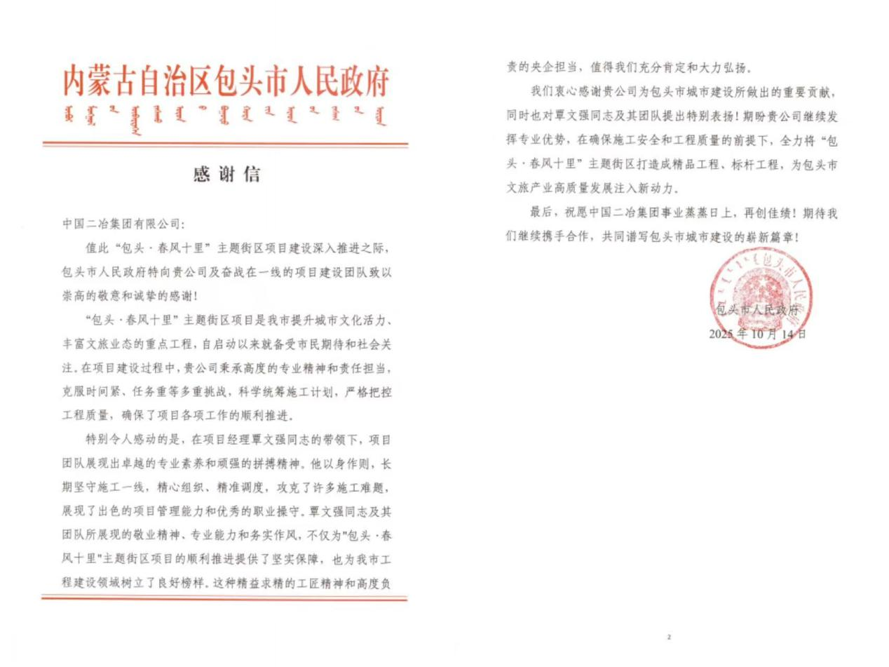 10月14日,中國(guó)二冶收到包頭市政府感謝信,對(duì)中國(guó)二冶在“包頭·春風(fēng)十里”主題街區(qū)項(xiàng)目建設(shè)中的突出貢獻(xiàn)表示感謝。